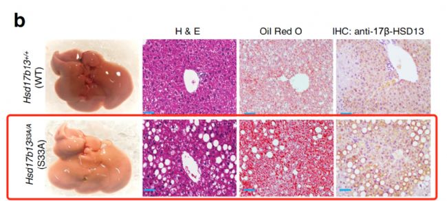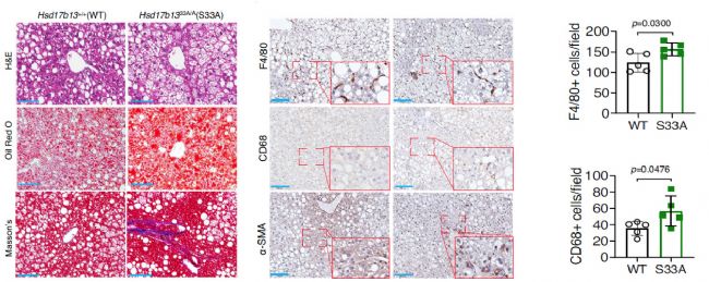 為了研究17β-HSD13絲氨酸33位磷酸化與NAFLD的功能相關性,研究人員使用CRISPR/Cas9基因編輯技術,構建了33位丙氨酸替代的絲氨酸表達失活型(S33A)小鼠模型Hsd17B1333A/A,并與野生型(Wild type,WT)對照組小鼠Hsd17b13+/+共同飼養5個月,Hsd17B1333A/A小鼠出現顯著的脂肪肝表型,經H&E和油紅O染色切片掃描(由芬蘭Grundium的Ocus便攜式數字病理切片顯微成像系統進行掃描),結果顯示Hsd17B1333A/A小鼠的肝部中央靜脈區域大量蓄積更大尺寸的肝細胞脂滴,同時IHC結果也顯示F4/80+和CD68+細胞浸潤(如圖1紅框)。結合其他相關實驗,證明17β-HSD13的絲氨酸33位磷酸化障礙促進了正常飲食小鼠的肝臟脂質積累和炎癥發生。