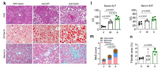 之后,為確定脂滴水解功能障礙是否會促進NASH的發生和發展,研究人員用高脂肪飲食(High-fat diet,HFD)喂養Hsd17b13+/+和Hsd17b1333A/A小鼠3個月。經組織學檢查、油紅O和Masson染色分析,Hsd17b1333A/A小鼠比Hsd17b13+/+小鼠表現出更嚴重的肝臟脂質積累、肝細胞氣球化和細胞外基質沉積癥狀,IHC掃描結果顯示,與WT小鼠相比,Hsd17b1333A/A小鼠的肝臟炎癥和纖維化進程顯著加快(如圖2)。利用腺病毒載體AAV在小鼠肝內誘導表達進行協同驗證,得到類似結果(如圖3)。相關實驗證明了Ser33殘基是17β-HSD13重要的磷酸化位點,并可能參與到ATGL依賴型脂肪水解的調控中,Ser33殘基的靶向突變促進了NASH的發展。