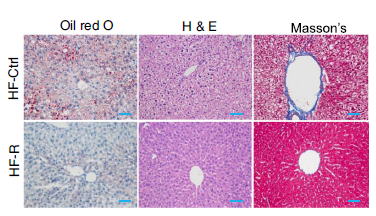 在獲得17β-HSD13絲氨酸33位磷酸化調控NALFD的相關結論后,研究人員通過計算機輔助藥物設計技術,從FDA批準的小分子藥物庫中篩選出干預NAFLD的潛在藥物—原用于治療哮喘的瑞普特羅。繼而單獨對實驗組小鼠進行瑞普特羅給藥,油紅O、H&E和Masson染色相關研究結果顯示,相比對照組HF-Ctrl,實驗組小鼠HF-R的肝臟脂滴大小和數量均顯著減少(如圖4)。同時結合蛋白和酯類的表達分析,瑞普特羅可以通過激活PKA信號通路增加17β-HSD13絲氨酸33位的磷酸化,并抑制NALFD的發生和發展,進一步提示靶向17β-HSD13絲氨酸33位磷酸化可能是干預NAFLD的潛在藥物靶點。