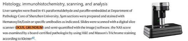 文章中小鼠病理組織經H&E染色、油紅O染色、IHC免疫組化及Masson染色后,均使用芬蘭Grundium公司生產的OCUS便攜式數字病理切片顯微成像系統進行掃描。