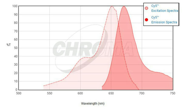 理想的熒光光源,一需要光譜覆蓋熒光染料的峰值激發波長,二需要在這個波長有較高的光強,這樣才能獲得更好的激發效果,對于CY5來說這個數值大概在650nm左右,而CY5.5則在670nm左右。