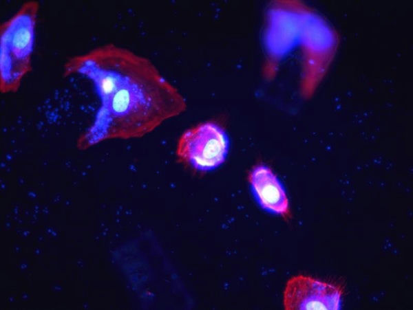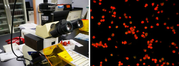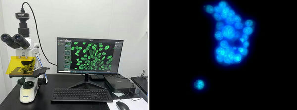 支原體屬于原核生物,可以使用DAPI等細胞核熒光染色劑染色,在熒光顯微鏡MF31鏡下,可見細胞核外出現大量小顆粒狀熒光反應,這是支原體感染的特征。