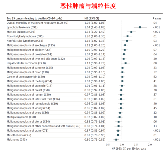 惡性腫瘤:惡性腫瘤、食管癌癥、淋巴白血病和髓系白血病在LTL較短的參與者中更為常見,而癌癥和黑色素瘤的發病率較低。