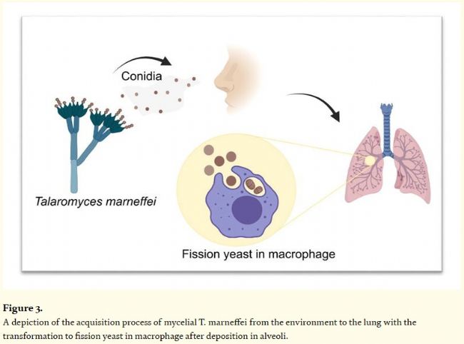 馬爾尼菲籃狀菌的孢子可以通過呼吸道進入人體,然后在肺部被巨噬細胞吞下,轉變為致病的酵母態,進而在肺、肝、腸淋巴組織、淋巴結及脾臟中繁殖引起系統性感染。