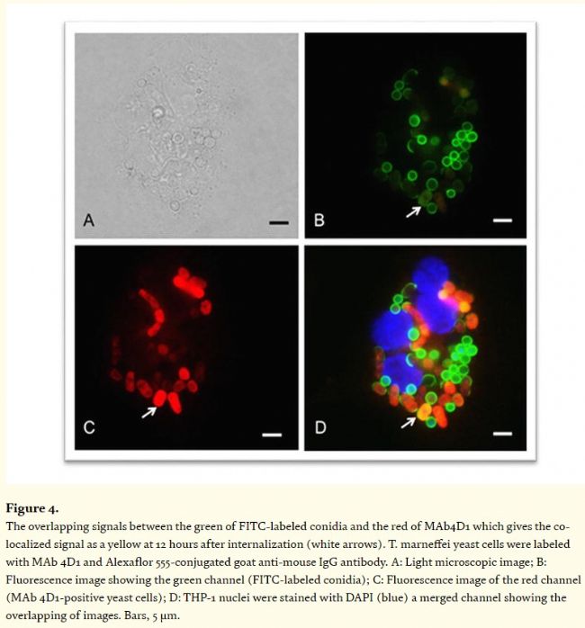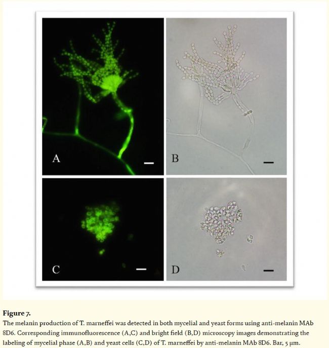 進一步研究馬爾尼菲籃狀菌的致病性,用FITC標記真菌黑色素,證明無論是菌絲態還是酵母態,都出現明顯的熒光反應,顯示馬爾尼菲籃狀菌雙態下都有真菌黑色素作為毒力因子,干擾宿主免疫系統正常響應,這可能是其能在體內深層引起多器官感染的其中一個原因。