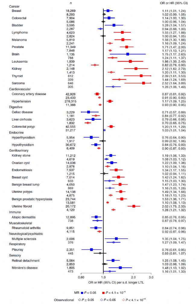 生物醫學性狀: 通過孟德爾隨機分析,作者發現了16種疾病與白細胞端粒長度(LTL)的遺傳決定有關。