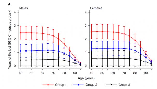 死亡與端粒長度:在40歲時,白細胞端粒長度(LTL)比人群平均值短1個標準差,人類預期壽命比LTL長≥1個標準差低2.5年。