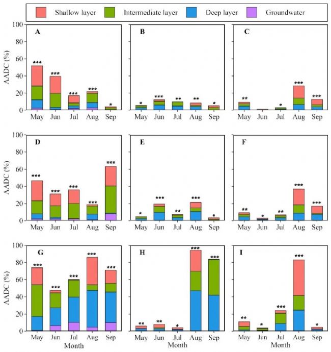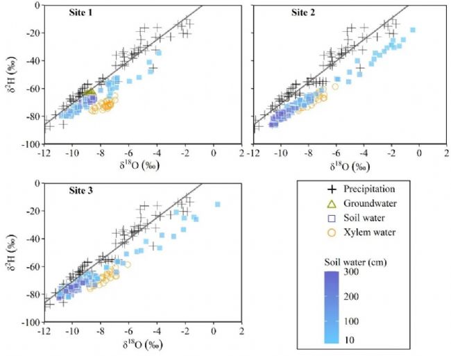 穩(wěn)定同位素已被廣泛應(yīng)用于根系水分吸收(RWU)的鑒定,通過將潛在水源分類為不同的端元,并評(píng)估其對(duì)木質(zhì)部水分的貢獻(xiàn)。然而,估計(jì)端元(主要是土層)的貢獻(xiàn)通常僅基于土壤水同位素的變化。土壤有效水分和根系分布是RWU的關(guān)鍵限制因子,但在水源分配中很少考慮。