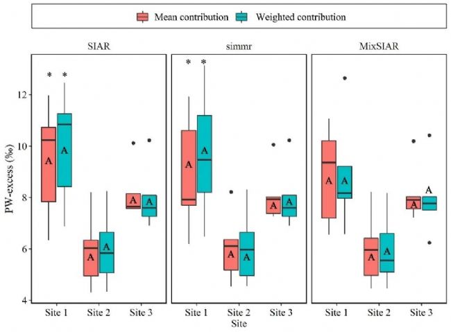 圖6 基于三種混合模型(SIAR、simmr和MixSIAR)分別獲得的平均貢獻(xiàn)率和加權(quán)貢獻(xiàn)率計(jì)算的PW-excess的比較。