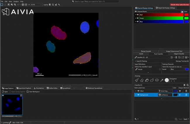 要創建Aivia稀有事件處理程序,只需使用事先通過概覽掃描任務采集的一些圖像對Aivia像素分類器進行訓練。使用簡單的繪圖工具,對需要的稀有事件進行標注,并確定圖像的背景。這樣,像素分類器就可以從概覽掃描圖像中獨立檢測到稀有事件。