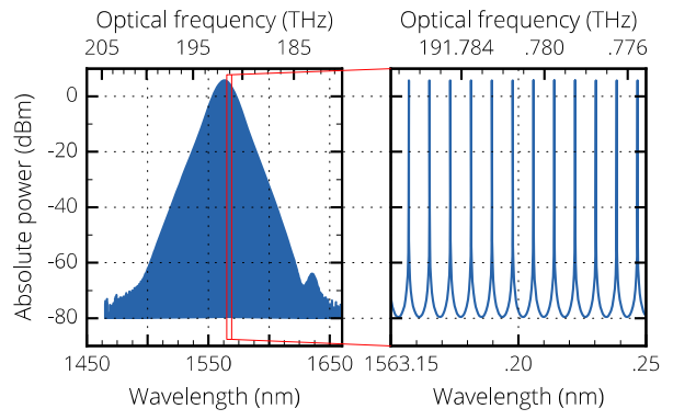 首先,傳統的激光器架構很難構建低噪聲且重復頻率> 0.5 GHz的諧振結構。然而近期,Menhir Photonics提出其MENHIR-1550飛秒激光器可以作為飛秒脈沖光梳的穩定光源模塊。其可以在100 MHz至5 GHz的重復頻率下產生超低噪聲的鎖模脈沖,且生成的每一根頻率梳線功率都大于50 μW。根據其實驗室所提供的資料,利用該激光器所形成的光梳可以做到線寬< 20 kHz,信噪比> 70 dbc。