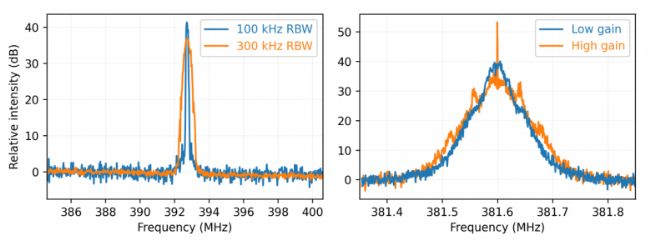 我們將放大器輸出連接到COSMO模塊,并調整放大器以提供zui強的fceo信號。在300 kHz分辨率帶寬下,fceo的信噪比約為36 dB,在100 kHz分辨率帶寬下,信噪比約為42 dB(圖3)。這樣的信噪比數據對于fceo所需的精確可靠的鎖定來說綽綽有余。然后,我們將fceo電信號連接到Vescent SLICE-OPL并開始反饋控制,這使得我們能夠將fceo鎖定到任意RF頻率(圖3,右側藍色曲線)。當我們增加反饋的增益時,我們看到fceo的中心變窄,“相干尖峰”出現在中心(圖3,右側橙色曲線)。這表明我們實現了fceo的精確鎖相。在fceo鎖中觀察到的環內剩余相位噪聲如圖4所示,證實了對頻率低于40 khz的相位噪聲有很強的抑制作用。