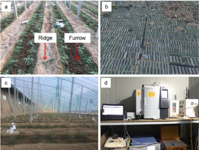 中國的設施蔬菜生產(GVP)系統正在迅速發展,其面積已超過4百萬公頃,占全球的80%以上。山東省是中國蔬菜主產區,其中壽光地區被譽為“中國設施蔬菜之鄉”, GVP面積超過當地土地面積的四分之一(圖1b)。為了實現產量及利潤的最大化, GVP系統通常過量灌水和施肥,年灌水量約2000mm,年氮肥施用量通常在2000 kg N ha-1以上,是露天菜地的2~5倍,谷類作物的4~5倍。大量的灌水和施肥能夠促進硝化和反硝化作用的發生,有利于土壤氧化亞氮(N2O)的釋放。已有一些研究關注到GVP系統中N2O的排放,發現常規施肥條件下N2O的年排放量在3.9~63 kg N ha-1yr-1之間。這種差異一方面反映了GVP系統中N2O排放的空間異質性,另一方面也反映了對于頻繁灌溉的GVP系統,低頻率采樣可能帶來的不確定性。此外,先前多數研究只關注了作物的生長季,缺少對悶棚時期N2O排放的監測,導致N2O排放量的低估。