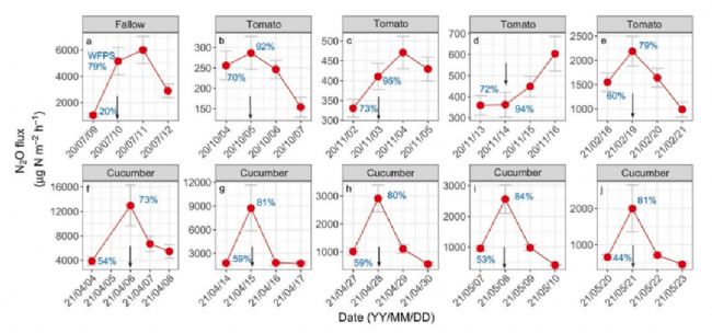 圖3.灌水前后畦上土壤N2O日均通量的變化。向下的箭頭表示灌水日期。數據點旁邊的藍色百分比表示0-10cm土壤WFPS。