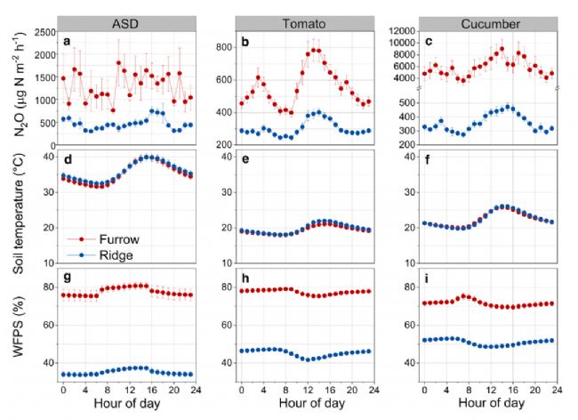 圖4.土壤N2O通量、5cm土壤溫度和0-10cm土壤WFPS的日動態。土壤N2O通量為厭氧土壤消毒時期(a,d,g)、番茄季(b,e,h)和黃瓜季節(c,f,i)的全部數據中不同時間的平均值。