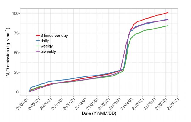 圖6. 研究期間不同采樣頻率下土壤N2O排放量模擬。紅色實線表示本研究中的每天三次采樣。在09:00-11:00間,以不同頻率(每天、每周和每兩周一次)采樣得出的N2O排放量以不同的顏色顯示。