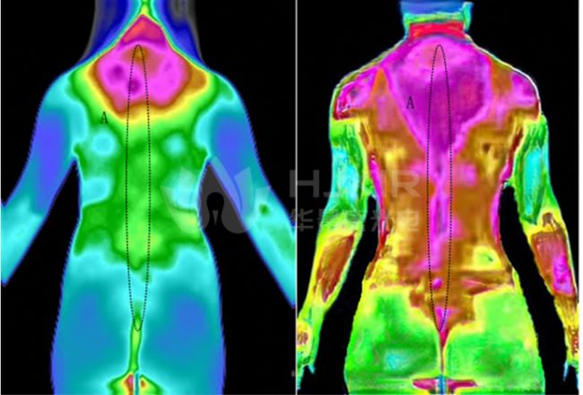 左為橋本甲狀腺炎患者胸后位圖,右為對照者胸后位圖,A 表示督脈