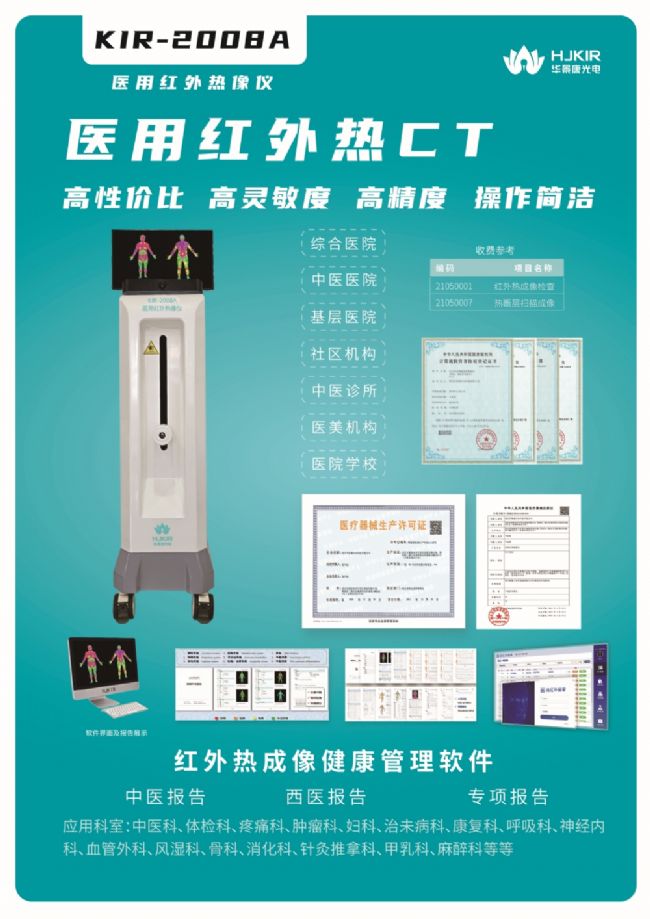 華景康KIR-2008A系列醫用紅外熱像儀,進口醫療級高靈敏度非制冷紅外焦平面探測器,專業紅外光學系統,輔以先進的測溫算法,專業的圖像及邊緣處理算法,在紅外成像質量及測溫指標多維度都有非常好的保障,華景康熱紅外分析管理軟件系統采用最先進的數據存儲及管理架構設計,信息創建、熱像數據采集、分析閱片、評估報告制作等功能簡潔實用,顯著提升用戶熱成像使用效率及分析評估水平,該系列醫用紅外熱像儀廣泛適用于基層醫療機構、鄉鎮衛生院、社區服務中心、中醫診所、體檢中心、醫療美容機構等。