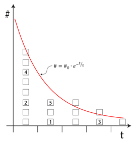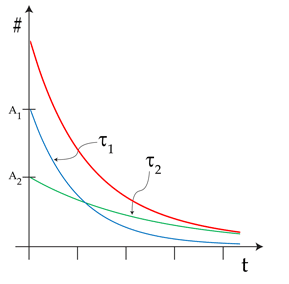 圖01c:擬合顯示,例如,兩個單衰變(藍色和綠色曲線),衰變時間t₁和t₂,振幅為A₁和A₂。求和將再次獲得紅色衰變曲線。