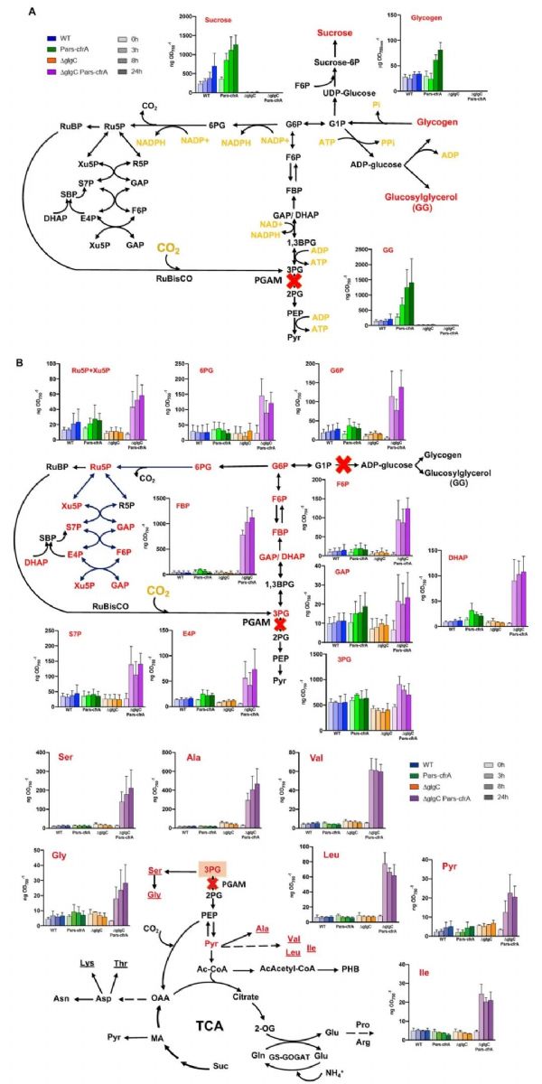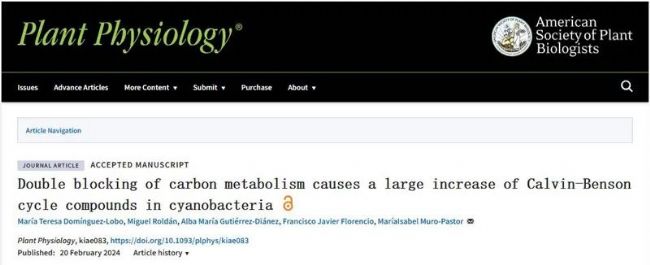 2024年2月20日,Plant Physiology雜志在線發表西班牙塞維利亞大學植物生物質能與光能研究所MaríaIsabel Muro-Pastor實驗室題為Double blocking of carbon metabolism causes a large increase of Calvin-Benson cycle compounds in cyanobacteria的研究論文。在本研究中,研究人員考慮到cfrA過表達的主要后果是糖原積累,研究了合成這種聚合物能力受損的Synechocystis sp.。María Teresa Domínguez-Lobo等人對野生型菌株和不能合成糖原的ADP-葡萄糖焦磷酸化酶突變體(ΔglgC)中的cfrA表達進行了表型比較分析。在野生型背景下,CfrA的積累會導致光合作用的重新調整,但不會影響生長。然而,在ΔglgC 菌株中,生長會隨著CfrA的積累而降低,光合作用也會受到嚴重影響。對細胞中的H、C和N含量進行的元素分析表明,野生型中cfrA的表達會導致C/N比值升高,這是由于氮同化減少所致。代謝組學研究表明,除了之前描述的糖原積累外,這些細胞還儲存了蔗糖和糖基甘油。然而,隨著cfrA的表達,缺乏糖原合成能力的細胞積累了大量卡爾文-本森循環中間產物。這些細胞中某些氨基酸的含量也有所增加,主要是丙氨酸、絲氨酸、纈氨酸、異亮氨酸和亮氨酸。研究結果表明,通過在不同條件和菌株中控制cfrA 的表達可以改變固定碳的分布,從而帶來潛在的生物技術效益。本研究中,Synechocystis sp. PCC 6803葉綠素熒光測量由雙通道葉綠素熒光儀DUAL-PAM-100完成。