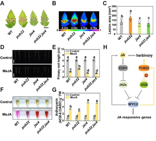 JA信號對于植物對壞死性病原體感染、冷凍和滲透脅迫的響應以及各種發育過程(如花青素積累、初生根發育、毛狀體形成和雄性繁殖力)也是必不可少的。為了進一步研究PUB22-JAZ4模塊在多種JA響應過程中的作用,作者檢測了pub22、jaz4及pub22 jaz4突變體的灰霉病抗性、MeJA處理后的初生根長及花青素含量。結果顯示,PUB22的缺失增加了植物對灰霉病的易感性,減弱了JA誘導的初生根長抑制及花青素積累,而這些JA響應在很大程度上被JAZ4的突變所緩解,表明PUB22-JAZ4廣泛參與多種JA響應過程(下圖A-G)。其中圖B,脅迫對光合生理的影響通過IMAGING-PAM葉綠素熒光成像系統測量。