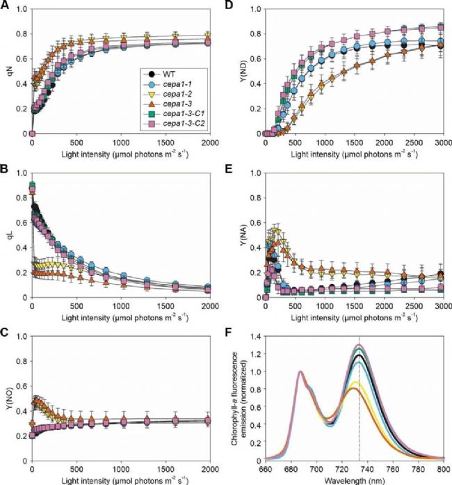 2024年2月21日,Plant Cell(IF.11.6)雜志在線發表德國馬普分子植物生理研究所Ralph Bock實驗室標題為CO-EXPRESSED WITH PSI ASSEMBLY1 (CEPA1) is a photosystem I assembly factor in Arabidopsis的研究論文。文章報告并描述了擬南芥中的PSI組裝因子CO-EXPRESSED WITH PSI ASSEMBLY1(CEPA1)。經生物信息學鑒定,CEPA1基因與已知的PSI組裝因子共同表達。CEPA1基因的缺失會導致植物表型蒼白和發育遲緩,但不會完全喪失光自養能力。生物物理和生物化學分析表明,這種表型是由PSI積累的特定缺陷引起的。研究人員還發現,CEPA1在翻譯后水平發揮作用,并與PSI共同定位在非垛疊的類囊體膜上。在活性凝膠電泳中,CEPA1與包括假定的PSI組裝中間體在內的類囊體蛋白復合物共同遷移。最后,蛋白質相互作用分析表明,CEPA1與PSI組裝因子PHOTOSYSTEM I ASSEMBLY3 PSA3相互合作。總之,本研究的數據支持CEPA1在PSI組裝中發揮重要但非必要的作用。本研究中,擬南芥光合活性相關的葉綠素熒光參數通過IMAGING-PAM葉綠素熒光成像系統和雙通道葉綠素熒光儀DUAL-PAM-100測量。