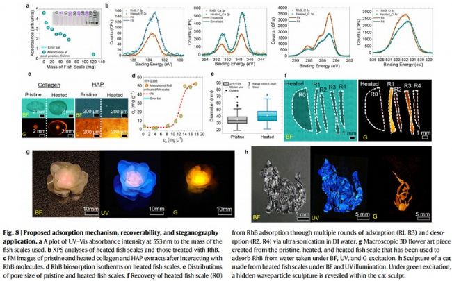 使用UV-Vis吸光度掃描,作者提出了熱加工魚鱗的吸附機理,并驗證實驗與Dubinin-Astakov模型適應(yīng)一致。隨后作者還驗證了超聲波清洗可以去除吸附的羅丹明B,恢復(fù)熱加工魚鱗的吸附功能。最后利用羅丹明B吸收特性,作者還嘗試制作了一些在UV激發(fā)和G激發(fā)下有不同外觀的宏觀隱寫工藝品。