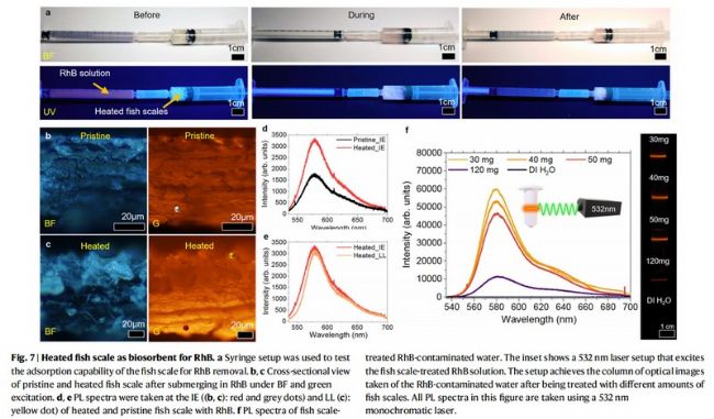 這篇論文的核心發(fā)現(xiàn)有兩個,就是通過加熱魚鱗可以改變魚鱗的熒光特性和物理特性,熒光特性可以用作隱寫信息實現(xiàn)防偽等功能;物理特性可以吸收水體羅丹明B污染物,其吸收較快且制造工藝簡單,有取代活性炭的潛力。