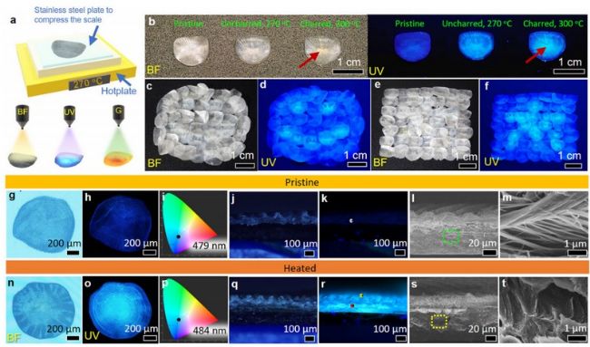 加熱會改變魚鱗的光學(xué)特性,那么加熱到多少、加熱多久合適呢?研究人員使用兩片不銹鋼壓平魚鱗,然后放到高溫熱臺上進行恒溫加熱3分鐘,再放到熒光顯微鏡下觀察。在熒光顯微鏡U激發(fā)下,可以看到未加工的魚鱗也有藍色的弱熒光激發(fā),加熱到270℃后的魚鱗熒光會增強,強度與未加工魚鱗有顯著差別,且在明場下看不出與未加工魚鱗的區(qū)別;加熱到300℃熒光還會增強,但魚鱗本身會碳化,變得容易脆斷。