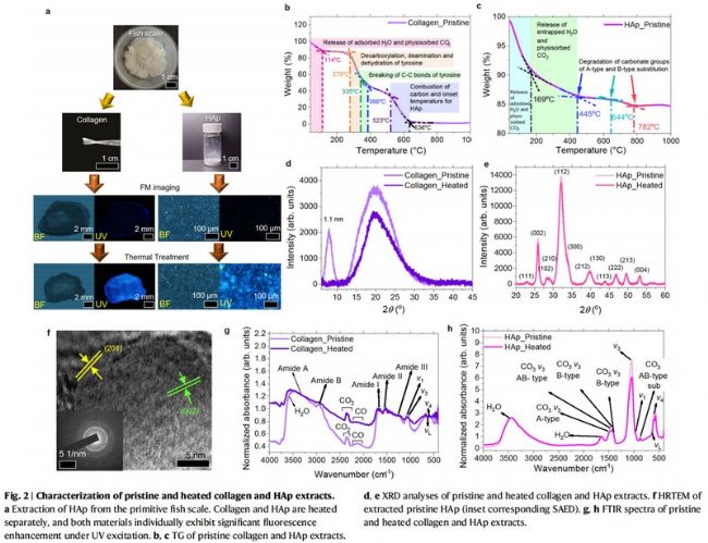 將魚鱗處理分離成膠原蛋白和HAp(羥基磷灰石),分別加熱,均可在熒光顯微鏡下觀察到熒光增強。使用XRD和FTIR等技術(shù)分析,結(jié)合電鏡成像,可以判斷加熱后的魚鱗發(fā)生了結(jié)構(gòu)變化和化學(xué)反應(yīng),形成多孔結(jié)構(gòu)和新的成分,多方面因素最終提升了紫外吸收和熒光強度。