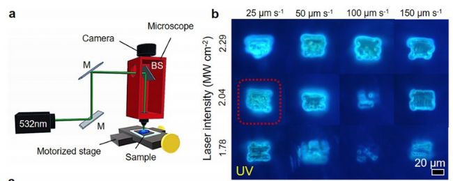 使用不同功率的聚焦激光作為光源,100X物鏡搭配電動載物臺進行局部加熱刻印測試,以找到均勻加熱的最佳功率和速度,結(jié)論是2.04MW/cm2功率激光,25μm/s速度時效果最佳。