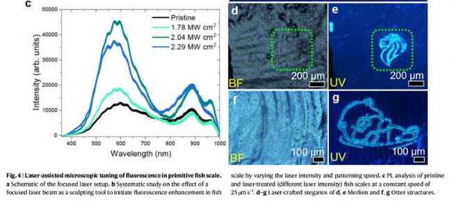 利用這個設(shè)置,研究人員成功在魚鱗上刻上了隱寫的魚尾獅和水獺的圖案,這個圖案在明場下不可見,只有使用紫外激發(fā)才能看到,實現(xiàn)類似防偽油墨的效果,但不會造成防偽油墨的污染,加工工藝也難以模仿。