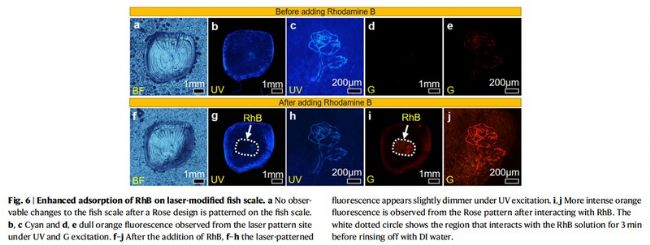 在魚鱗上制作隱寫的玫瑰圖案,再將加工過的魚鱗浸泡在羅丹明溶液中3分鐘后洗凈,對比前后,可以看到熱加工后魚鱗部分出現(xiàn)了羅丹明吸收的增強,可以在G綠光激發(fā)下觀察到羅丹明熒光的玫瑰圖案。