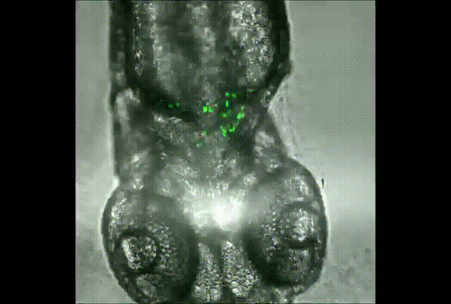 通過心肌細胞(GFP)可以跟蹤心跳動態。透射可觀察到相應的血流。通過 DLS 光片成像、熒光和透射獲得的視頻。