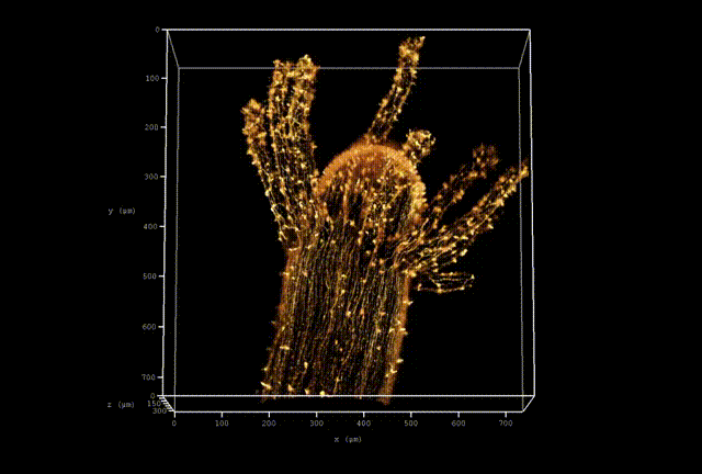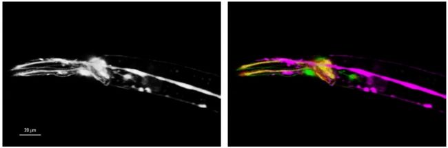 用四種紅色熒光蛋白標記的秀麗線蟲神經元的三維共焦圖像。