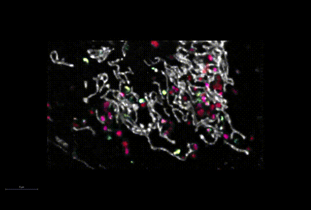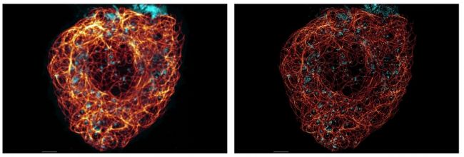 TauSTED 775 解析了用 SiR-tubulin(熒光 - Spyrochrome)標記的錯綜復雜的細胞骨架網絡,以及用 CF594(青色 - Biotium)標記的運輸囊泡。