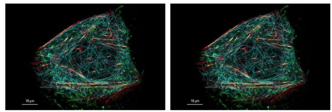 使用 STELLARIS STED 采集的圖像。使用肌動蛋白(SiR-actin,熒光)、微管(SPY555-tubulin,青色)和膜(CF488A 偶聯 WGA,綠色)標簽對 U2OS 細胞進行活細胞 TauSTED 檢測。SiR 和 SPY 可從 Spirochrome 購買。CF 染料可從 Biotium Inc. 比例尺: 10 微米