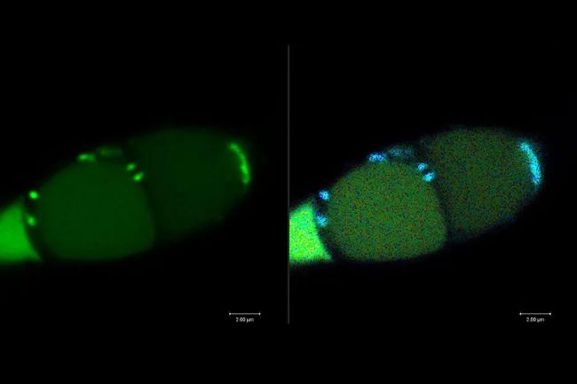 TauContrast 可區分真菌不同細胞區中的相同熒光蛋白。稻瘟病真菌線粒體定位的 GFP。隨著新細胞的形成(右側),老細胞死亡,液泡中開始出現 GFP。我們可以從 GFP 通道(左側)看到這一點,但我們也看到了一個很好的 TauContrast 變化,即液泡中的 GFP 的 AAT(平均到達時間)比線粒體中的更長。樣品由新加坡淡馬錫生命科學實驗室 Naweed Naqvi 實驗室Shen Qing 提供。