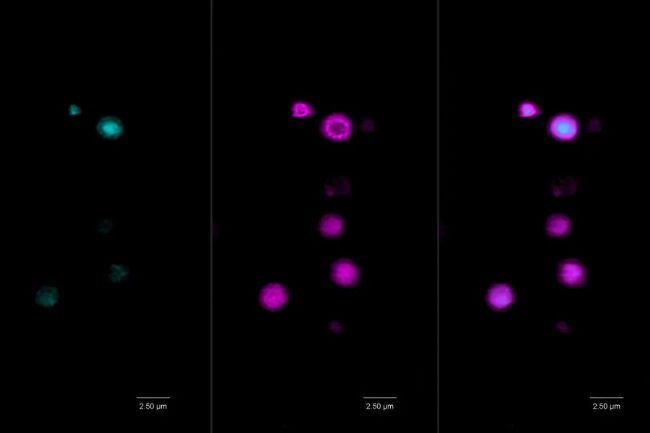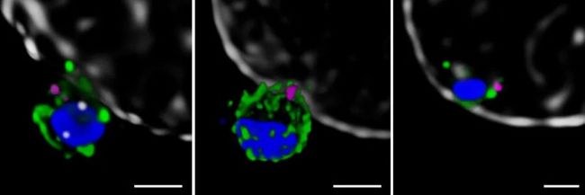 STED 用于瘧疾研究:STED 納米顯微鏡下寄主紅細胞內寄生子孢子的侵襲。三維 STED 圖像顯示 RON4(品紅色)與蛋白質 PfRh5(左圖,綠色)、PfRipr(中圖,綠色)和 PfCyRPA(右圖,綠色)的重疊。DAPI 染色的核顯示為藍色,紅細胞膜顯示為灰色。比例尺: 1 微米。圖片由澳大利亞沃爾特和伊麗莎白醫學研究所的Jennifer Volz、Alan Cowman,以及德國歐洲分子生物學實驗室的Marko Lampe 提供。