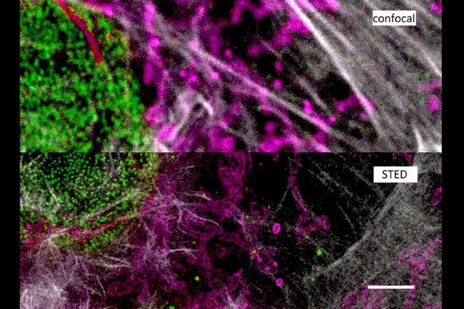 用 NUP153(綠色)、TOM20(品紅色)和 SiR-actin(灰色)抗體染色的 Cos 7 細胞的三色 STED 成像。共焦(上)和 STED(下)。比例尺:2μm。樣本由瑞士蘇黎世大學 ZMB 的 Urs Ziegler 和 Jana Doehner 提供。