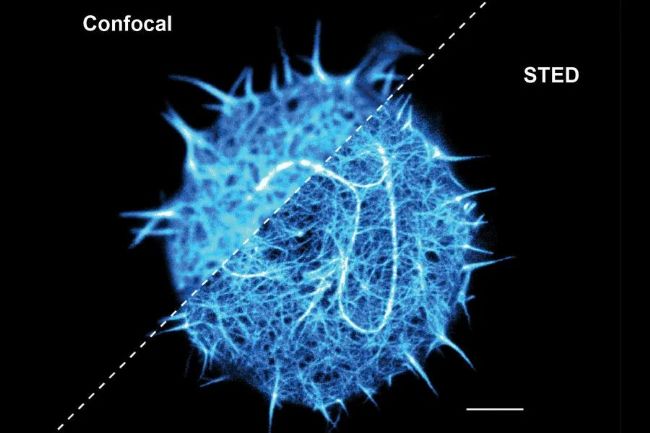 共焦和 STED 堆積的 3D 重建。圖像由英國牛津大學分子醫學韋瑟爾分子醫學研究所 MRC 人類免疫學單元的 Marco Fritsche、Mathias Clausen 和 Christian Eggeling 提供。