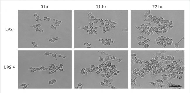 ® Mini plus對Raw264.7細胞進行實時監(jiān)測,結果表明,與未經(jīng)過LPS處理(200ng/mL)的細胞相比,處理組細胞粘附得更加牢固,變得更寬更平(圖7)。