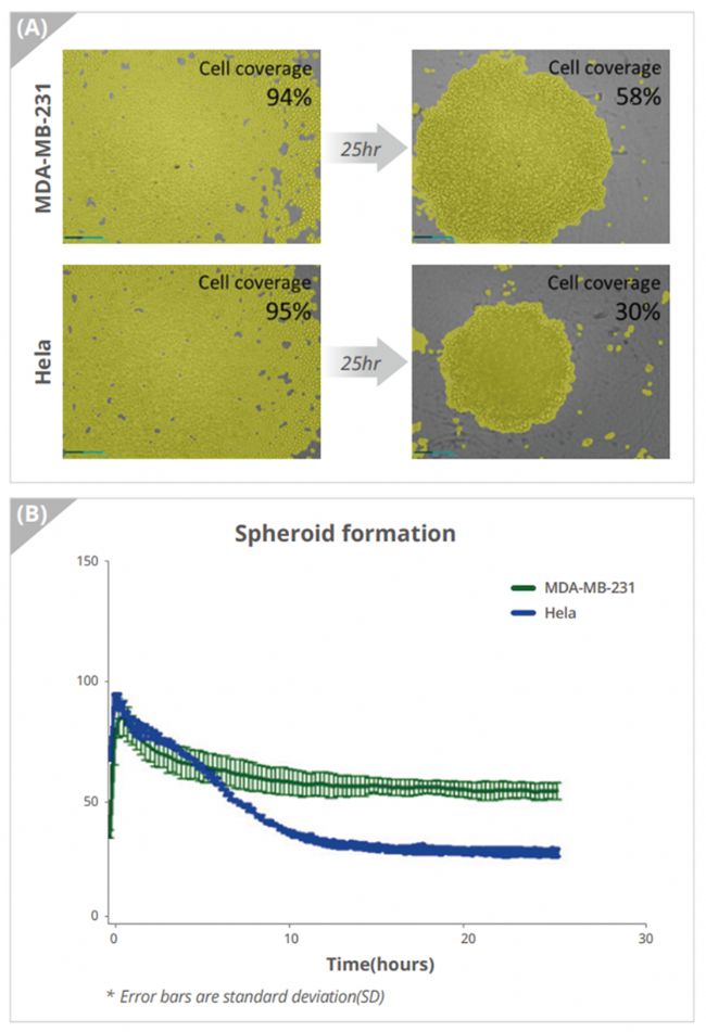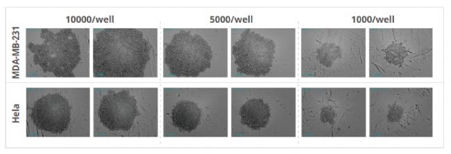如果能通過實時成像確定球形面積的變化,我們就能知道球體形成何時完成(面積不再變化時),并可以選擇聚集效率更高的細(xì)胞。MDA-MB-231和HeLa細(xì)胞每孔接種5000個,使用Celloger