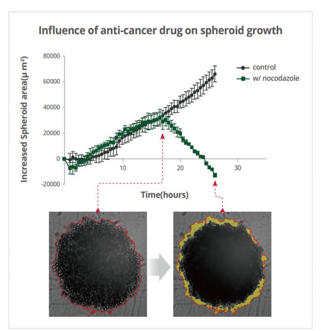 ® Mini Plus在4×物鏡下延時成像得到球體面積的結(jié)果,發(fā)現(xiàn)無論藥物處理與否,球體大小持續(xù)增加直至18小時。未給予Nocodazole治療的球體大小在18小時后仍在增加,而給予Nocodazole治療的球體大小在18小時后逐漸降低(圖5)。