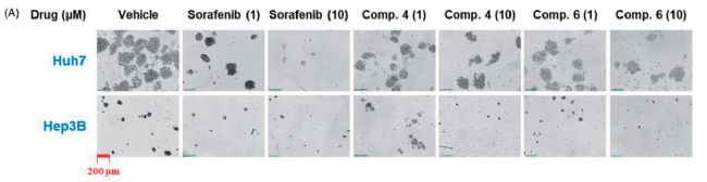 3.使用不同的藥物作用細(xì)胞48小時后,檢測Hep3B和Huh7細(xì)胞的成球能力。將細(xì)胞按10
