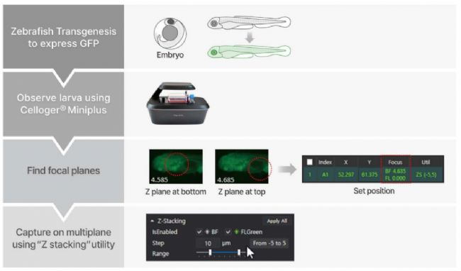 Celloger® Mini Plus提供了一個自動生成多層圖像的Z-stacking功能,Celloger®分析軟件提供了一個合并功能,可以輕松地組合多層熒光圖像。這些功能使研究人員能夠在單個圖像中觀察三維(3D)結構。通過功能表達綠色熒光蛋白(GFP)觀察轉基因斑馬魚(幼魚),詳見下面的步驟1和2。