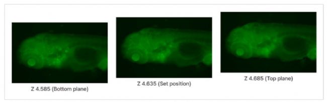我們使用Celloger® MiniPlus來創建轉基因斑馬魚的Z-stacking圖像。由于3D幼魚的每個部分可接受的焦平面不同,我們通過操縱自動移動的Z軸來驗證合適的焦平面。我們在多個焦平面中識別出了上焦平面(Z=4.585)和下焦平面(Z=4.685),并將中間對應的坐標(Z=4.635)設置為掃描位置;并且以掃描位置為中心,在位置的上方和下方各設置以10µm間隔拍攝5張照片(圖5)。