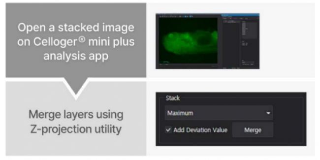 在Celloger®分析軟件中打開Z-stacking拍攝的圖像,點擊Z-stack選項卡上的“merge”按鈕,可以得到Z-projection圖像(圖8)。不同的樣本對應的Z-projection類型不同,建議對每種類型進行確認。