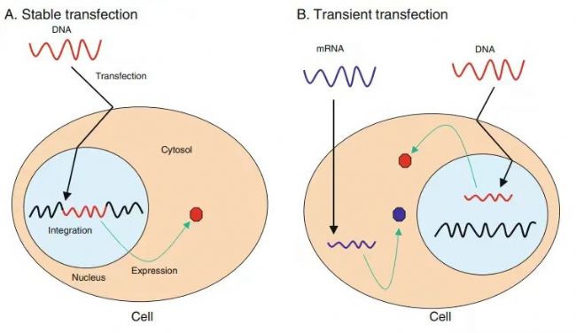 圖1 穩(wěn)定轉(zhuǎn)染與瞬時轉(zhuǎn)染的示意圖[2]