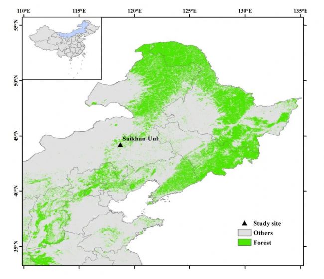 東北地區研究區的位置及其森林分布(綠色)。“其他”是指林地(灰色)以外的土地利用類型。